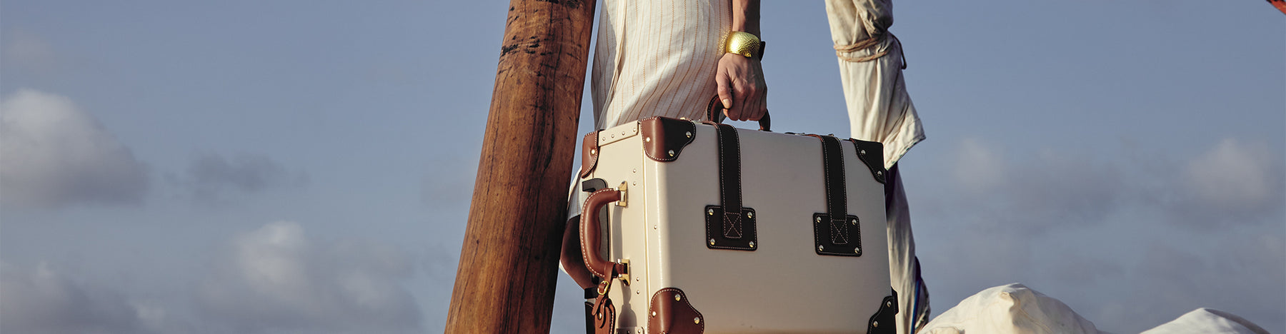 The Diplomat is inspired by the roaring 1920s and the heyday of travel. Timeless colorways include jet black, hunter green, porcelain cream, and di... The Diplomat is inspired by the roaring 1920s and the heyday of travel. Timeless colorways include jet black, hunter green, porcelain cream, and diplomat red against our rich brown signature leather wide-T straps with original snaffle bit print inside. Choose your color story then build your collection of vintage trunk suitcases. Ideal for family adventures and cross-country getaways. Our vintage Diplomat suitcases are perfect for international and domestic travel because they are secured with leather-wrapped corners and designer nylon protective covers. Your adventure begins now.